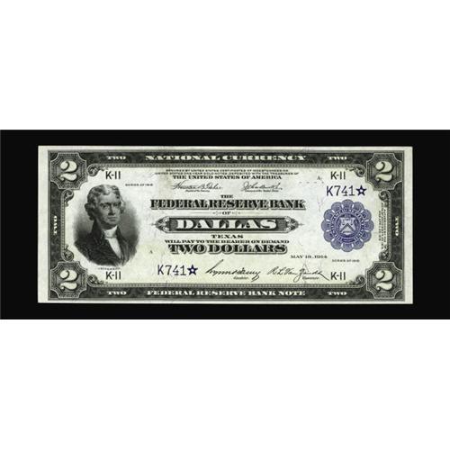 <B>Fr. 776 $2 1918 Federal Reserve Bank Star Note Gem New.</B></I> There has been only one reported Dallas Battleship star for years until this newly discovered piece steamed into our halls. Dark inks and embossing are detected along with white paper. A couple of counting crinkles are noticed, but no actual circulation folds are found. Simply delightful and rare.<BR><I>From The Plymouth Rock Collection</B></I>