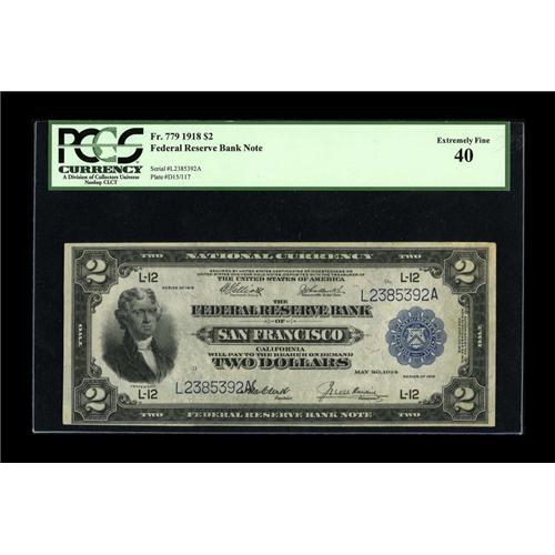 <B>Fr. 779 $2 1918 Federal Reserve Bank Note PCGS Extremely Fine 40.</B></I> The folds are light on this San Fran Battleship.<BR><I>From The Collection of Greg Southward</B></I><BR><BR><b>Shipping:</b> Coins & Currency (<a target="_blank" href="http://www.heritageauctions.com/common/shipping.php">view shipping information</a>)