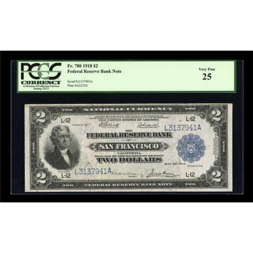 <B>Fr. 780 $2 1918 Federal Reserve Bank Note PCGS Very Fine 25.</B></I> This is a pleasing mid-grade example.<BR><I>From The Kansas City Collection.</B></I><BR><BR><b>Shipping:</b> Coins & Currency (<a target="_blank" href="http://www.heritageauctions.com/common/shipping.php">view shipping information</a>)