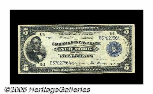 <B>Fr. 782 $5 1918 Federal Reserve Bank Note Fine.</B></I> This New York $5 left the environs of the Big Apple for numismatics without any edge tears or pinholes.