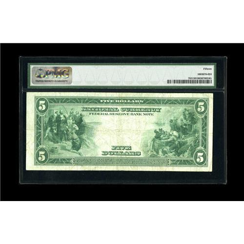 <B>Fr. 783 $5 1918 Federal Reserve Bank Note PMG Choice Fine 15.</B></I> The Series 1918 $5 FRBN is comprised of two signature combinations and thus two Friedberg numbers. The census for both numbers indicate populations about fewer than three dozen notes each. This piece is previously unreported and is a welcome addition as it is a pleasing note with no distractions.<BR><I>Ex: Rickey Collection</B></I>