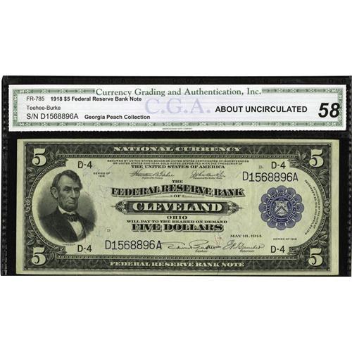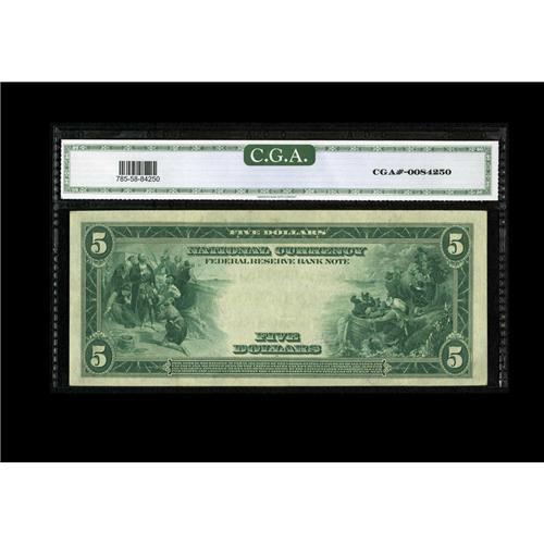 <B>Fr. 785 $5 1918 Federal Reserve Bank Note CGA About Uncirculated 58.</B></I> One of the folds is clearly visible to the right of the seal. The colors remain bright.