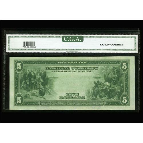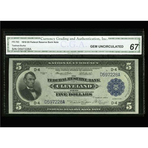<B>Fr. 785 $5 1918 Federal Reserve Bank Note CGA Gem Uncirculated 67.</B></I> This Cleveland District FRBN Five is a simply lovely piece, with boardwalk margins all the way around, bright colors and perfect centering of both sides. A very lovely example of a type that we have always felt is considerably underrated in top grade.