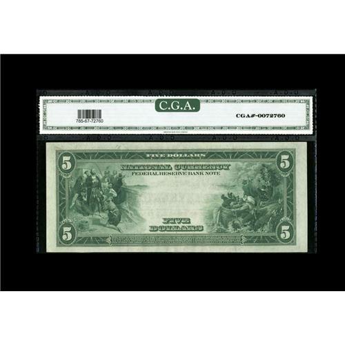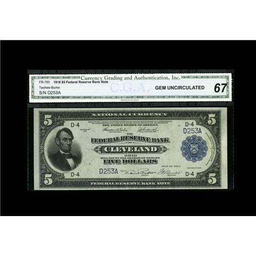 <B>Fr. 785 $5 1918 Federal Reserve Bank Note CGA Gem Uncirculated 67.</B></I> While Cleveland FRBN Fives are common, this bright and well-centered three-digit example will surely make its new owner proud.