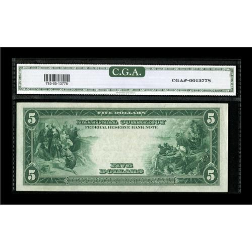 <B>Fr. 785 $5 1918 Federal Reserve Bank Note CGA Gem Uncirculated 65.</B></I> Broad margins and deeply printed design elements add to the allure of this three digit FRBN. A few of the serial numbers right around this one are known, and almost all of them are purported to be Uncirculated.<BR><BR><b>Shipping:</b> Coin/Currency (<a target="_blank" href="http://www.heritageauctions.com/common/shipping.php">view shipping information</a>)