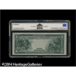 Fr. 785 $5 1918 Federal Reserve Bank Note CGC Choice <B>Fr. 785 $5 1918 Federal Reserve Bank Note CGC Choice Uncirculated 64.</B></I> The original embossing can still be seen through the anti-tank holder. The note appears to have been held to the "64" grade due to its somewhat tight bottom margin, as it looks Superb in every other sense. <BR><BR><B>Important notice:</B> Heritage usually auctions material at the rate of 200-250 lots per hour. On some occasions eBay Live bid software or the Internet may not be able to keep up with the pace of the auction. We recommend placing a realistic absentee bid now as insurance to avoid disappointment. Occasionally the auctioneer may eliminate or reject an eBay Live bid, and the auctioneer may also reopen a lot after the close of the eBay live bidding (usually because we missed an audience bid), and may reject your bid even if it shows you as the winning bidder. By bidding via eBay Live, you agree that Heritage may award the lot to another bidder at its sole discretion under the circumstances described above or any other reasonable circumstances. Since eBay bids are not shown to us until we open the lot on the floor, we treat those bids just like floor bids. In most cases the floor responds before the eBay bid is presented to us, due to Internet lag time, so for consistency we have made it a policy that floor bids are always considered first over tie eBay live bids. Also please note that all Heritage lots purchased through eBay Live carry a 20% Buyer's Premium. Please make sure you read the Terms and Conditions before you bid. This lot is being auctioned in conjunction with a live floor auction by Heritage Galleries & Auctioneers. All final auction and invoice information will be supplied by Heritage Galleries & Auctioneers, and all other information should be considered preliminary. Lot:17645