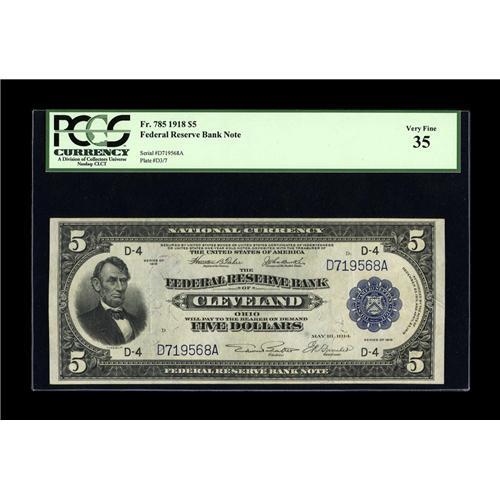 <B>Fr. 785 $5 1918 Federal Reserve Bank Note PCGS Very Fine 35.</B></I> This is a pleasing mid-grade note off the Cleveland district. Even margins surround this colorful example which is a favorite among collectors.<BR><I>From The Collection of Daniel Weissman</B></I><BR><BR><b>Shipping:</b> Coin/Currency (<a target="_blank" href="http://www.heritageauctions.com/common/shipping.php">view shipping information</a>)