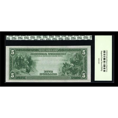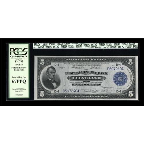 <B>Fr. 785 $5 1918 Federal Reserve Bank Note PCGS Superb Gem New 67PPQ.</B></I> Superb Gem Large Size FRBNs are just plain scarce. The pieces were printed on sheets with little space between them and as a result, most pieces simply do not have the margins for the full Superb grade. This piece boasts jumbo margins for the issue and they are even from side to side and top to bottom. Aside from a single Ace, this is the first PMG or PCGS Superb Gem graded FRBN to grace our auctions. Although PCGS' population report has not been published, PMG's records only show one piece graded 67 or higher. <BR><BR><b>Shipping:</b> Coins & Currency (<a target="_blank" href="http://www.heritageauctions.com/common/shipping.php">view shipping information</a>)