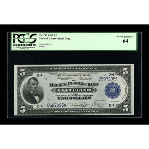 <B>Fr. 785 $5 1918 Federal Reserve Bank Note PCGS Very Choice New 64.</B></I> Pleasing margins are seen on this colorful Cleveland $5 FRBN. Always a desirable type note.<BR><BR><b>Shipping:</b> Coins & Currency (<a target="_blank" href="http://www.heritageauctions.com/common/shipping.php">view shipping information</a>)