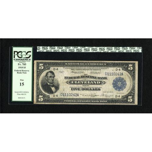 <B>Fr. 785 $5 1918 Federal Reserve Bank Note PCGS Fine 15.</B></I> A pleasing average circulated Cleveland $5 FRBN that is nicely centered.<BR><I>From The J.S. Weber Collection.</B></I><BR><BR><b>Shipping:</b> Coins & Currency (<a target="_blank" href="http://www.heritageauctions.com/common/shipping.php">view shipping information</a>)