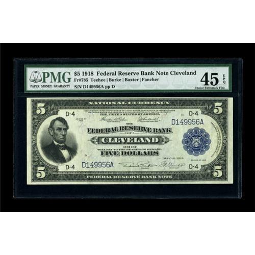 <B>Fr. 785 $5 1918 Federal Reserve Bank Note PMG Extremely Fine 45 EPQ.</B></I> This pleasing mid-grade note from the Cleveland district displays even margins. Plenty of embossing is also noticed on this example. <B><BR></B></I><I>From The Drew Keough Collection</B></I><BR><BR><b>Shipping:</b> Coins & Currency (<a target="_blank" href="http://www.heritageauctions.com/common/shipping.php">view shipping information</a>)