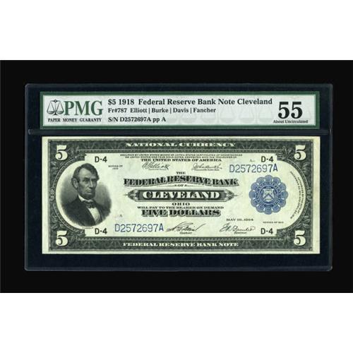 <B>Fr. 787 $5 1918 Federal Reserve Bank Note PMG About Uncirculated 55.</B></I> An elusive example in the higher grades. This 1918 Cleveland note is bright with even margins framing surfaces impeded by a corner and center fold.<B><BR></B></I><I>From The Warren Marshall Collection</B></I><BR><BR><b>Shipping:</b> Coins & Currency (<a target="_blank" href="http://www.heritageauctions.com/common/shipping.php">view shipping information</a>)