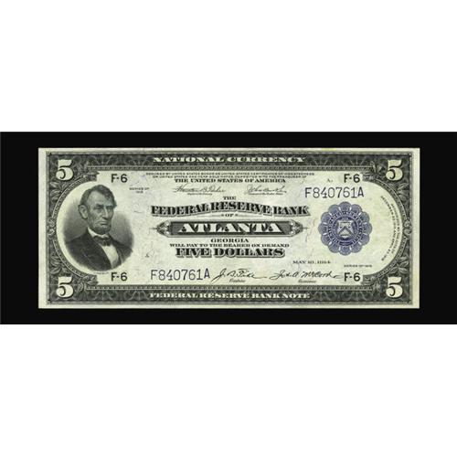 <B>Fr. 789 $5 1915 Federal Reserve Bank Note Gem New.</B></I> Nicely margined and centered is this white paper $5 Atlanta note.<BR><I>From The Plymouth Rock Collection</B></I>
