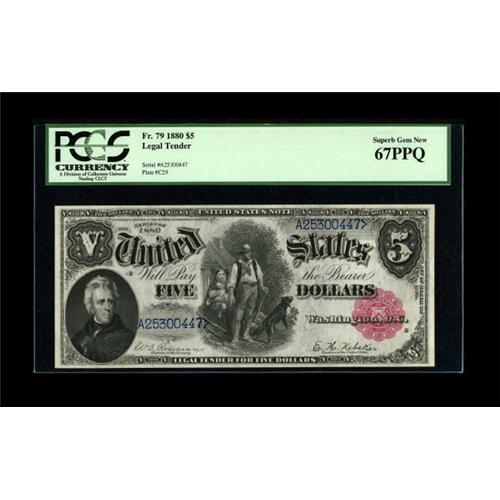 <B>Fr. 79 $5 1880 Legal Tender PCGS Superb Gem New 67PPQ.</B></I> While PCGS has not released a population report, PMG has only graded one note at this level. Plenty of embossing, along with near perfect margins, are complemented by dazzling color.<BR><BR><B>Coin Engraver:</B> James B. Longacre<BR><BR><b>Shipping:</b> Coins & Currency (<a target="_blank" href="http://www.heritageauctions.com/common/shipping.php">view shipping information</a>)