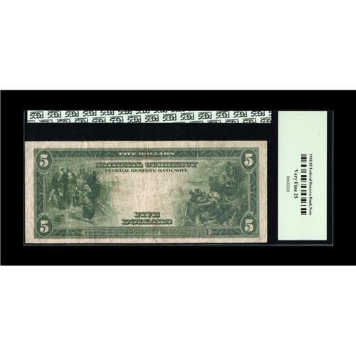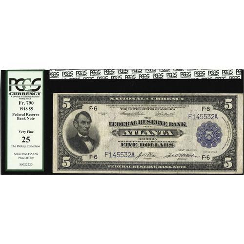 <B>Fr. 790 $5 1918 Federal Reserve Bank Note PCGS Very Fine 25.</B></I> This note has been off the market for about two years. Surprisingly, the Series 1918 Atlanta $5 is comprised of five Friedberg numbers, yet only about a hundred examples are known of all five issues in total. The surfaces are distraction-free and the paper solid.<BR><I>Ex: Rickey Collection</B></I>