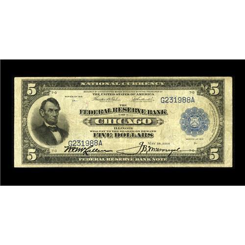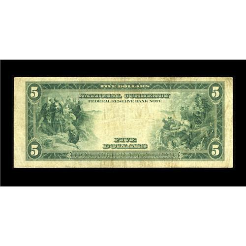 <B>Fr. 793 $5 1915 Federal Reserve Bank Note Fine.</B></I> Bold signatures of Secretary McLallen and Governor McDougal grace the bottom of this note. The fair amount of wear is even, though weakens part of the design on the back. Despite an original release of 250,000 notes, only 33 examples of this issue are known.<BR><I>From The Bill and Kathy Stella Currency Collection</B></I><BR><BR><b>Shipping:</b> Coin/Currency (<a target="_blank" href="http://www.heritageauctions.com/common/shipping.php">view shipping information</a>)