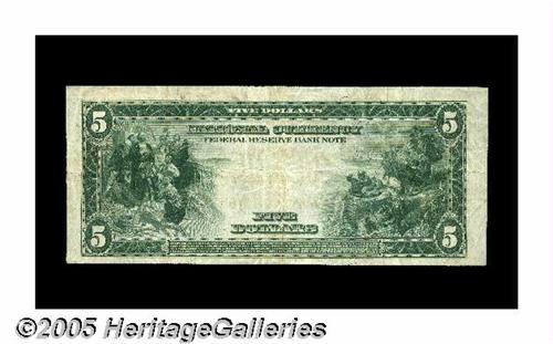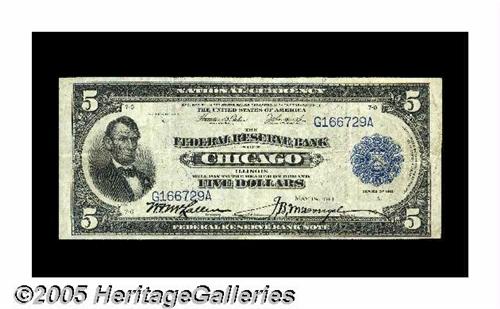 <B>Fr. 793 $5 1915 Federal Reserve Bank Note Fine-Very Fine.</B></I> This scarce Chicago $5 FRBN is outnumbered by the other Chicago signature combination by four to one.