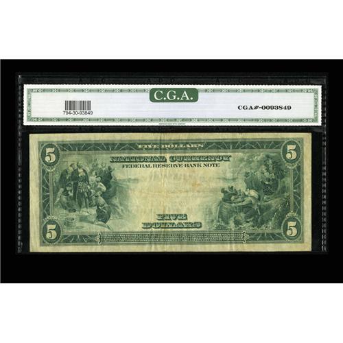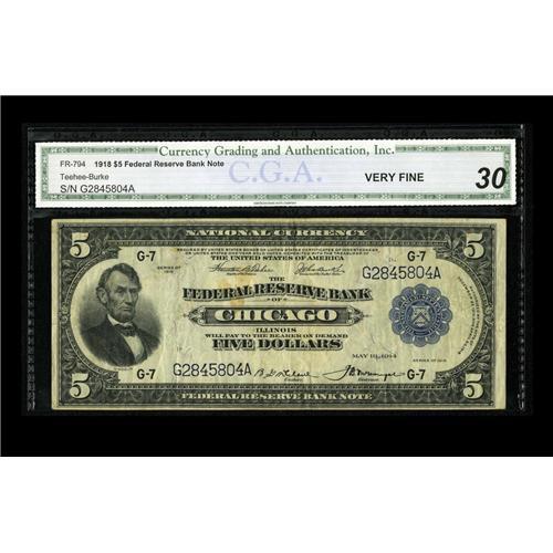 <B>Fr. 794 $5 1918 Federal Reserve Bank Note CGA Very Fine 30.</B></I> Some mottled toning is noted on this otherwise wholly original FRBN.