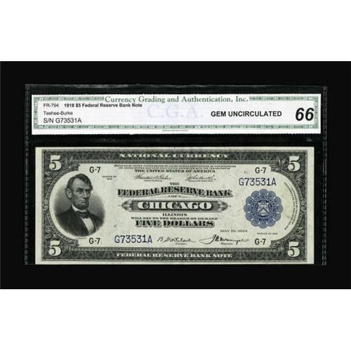 <B>Fr. 794 $5 1918 Federal Reserve Bank Note CGA Gem Uncirculated 66.</B></I> Most recently seen in our 2007 Central States Signature Auction. Expect this bright, well margined Chicago FRBN to realize in the range of...<BR><BR><b>Shipping:</b> Coins & Currency (<a target="_blank" href="http://www.heritageauctions.com/common/shipping.php">view shipping information</a>)
