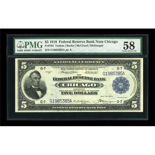 <B>Fr. 794 $5 1918 Federal Reserve Bank Note PMG Choice About Unc 58.</B></I> A soft center fold can clearly be seen on this Chicago FRBN, which is elusive in the higher grades.<B><BR></B></I><I>From The John Ameen Collection</B></I><BR><BR><b>Shipping:</b> Coins & Currency (<a target="_blank" href="http://www.heritageauctions.com/common/shipping.php">view shipping information</a>)