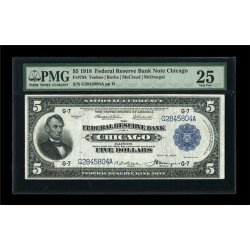 <B>Fr. 794 $5 1918 Federal Reserve Bank Note PMG Very Fine 25.</B></I> The paper is bright white and contrasts nicely with the bright blue overprint.<BR><BR><b>Shipping:</b> Coins & Currency (<a target="_blank" href="http://www.heritageauctions.com/common/shipping.php">view shipping information</a>)