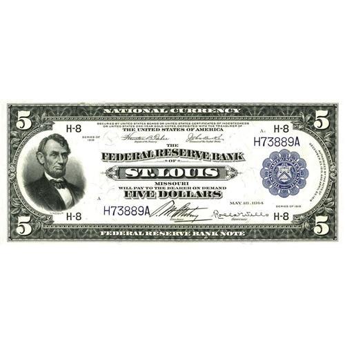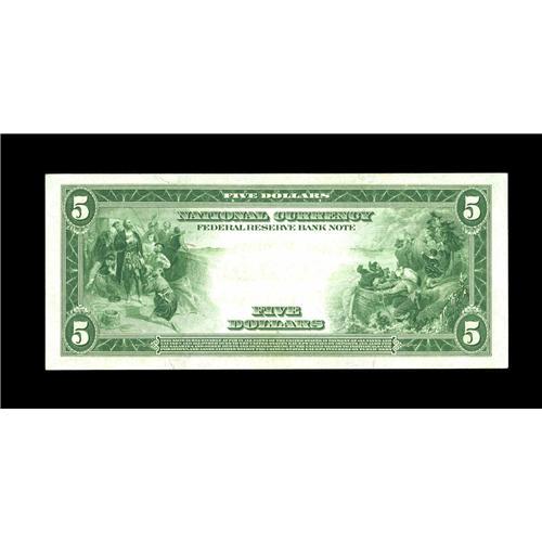 <B>Fr. 796 $5 1918 Federal Reserve Bank Note About New.</B></I> This piece faces up as a full Gem with broad margins and spectacular color. The note though shows one light bend to the right of center and a couple of minor closed pinholes.<BR><I>From The Plymouth Rock Collection</B></I>