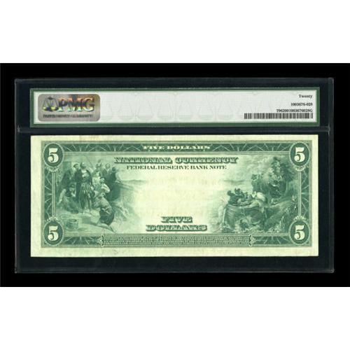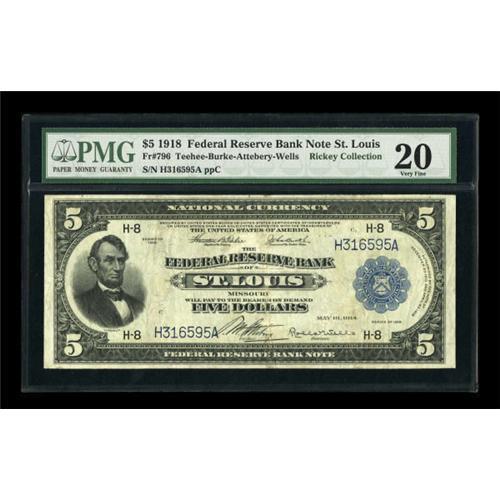 <B>Fr. 796 $5 1918 Federal Reserve Bank Note PMG Very Fine 20.</B></I> The devices are deeply printed and the paper remains whole.<BR><BR><b>Shipping:</b> Coins & Currency (<a target="_blank" href="http://www.heritageauctions.com/common/shipping.php">view shipping information</a>)