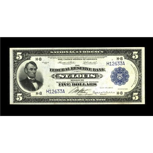 <B>Fr. 796 $5 1918 Federal Reserve Bank Note Very Fine-Extremely Fine.</B></I> This St. Louis issue is listed in the census, though lacks a grade. The few folds and bends that account for the grade are mostly lost as the note is a touch flat. Regardless, the note appears fully uncirculated in its currency sleeve.<BR><I>From The Bill and Kathy Stella Currency Collection</B></I><BR><BR><b>Shipping:</b> Coin/Currency (<a target="_blank" href="http://www.heritageauctions.com/common/shipping.php">view shipping information</a>)
