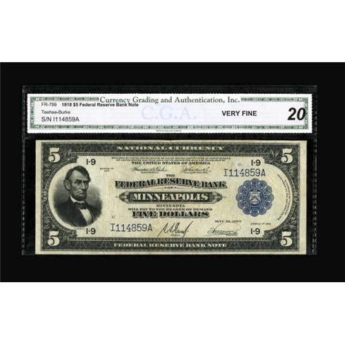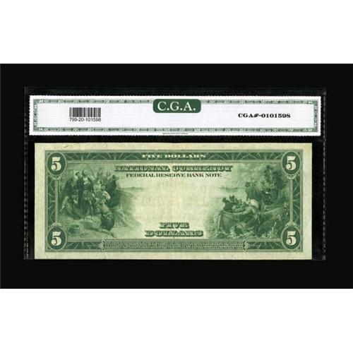 <B>Fr. 799 $5 1918 Federal Reserve Bank Note CGA Very Fine 20.</B></I> This is a slightly better issue which infrequently appears in higher grade. The note is moderately circulated and without distraction.<BR><BR><b>Shipping:</b> Coins & Currency (<a target="_blank" href="http://www.heritageauctions.com/common/shipping.php">view shipping information</a>)