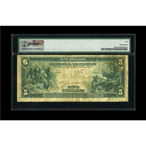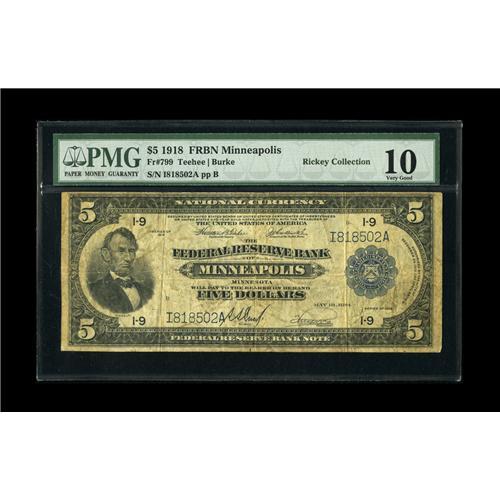 <B>Fr. 799 $5 1918 Federal Reserve Bank Note PMG Very Good 10.</B></I> Though heavily soiled, this note is fully intact and the devices remain solid. A quick look at the census reveals that only one uncirculated example of this issue exists.<BR><I>Ex: Rickey Collection</B></I>