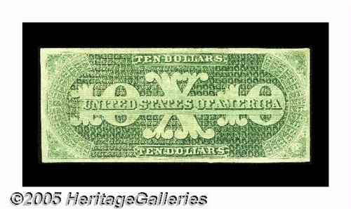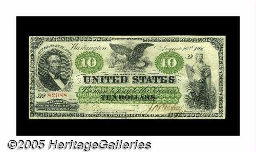 <B>Fr. 8 $10 1861 Demand Note Choice Very Fine.</B></I> The technical grade belies the attractiveness of this Demand note. The margins are extraordinary for the type, and the note is utterly without a flaw save for the normal circulation one would expect for the grade. It's free of soil, with perfect color, and the eye appeal of an XF or better note. Only about three dozen Fr. 8's are known--most considerably lower grade than this, and most of the other examples with less eye appeal than this note. A perenially undervalued type in this cataloger's opinion.