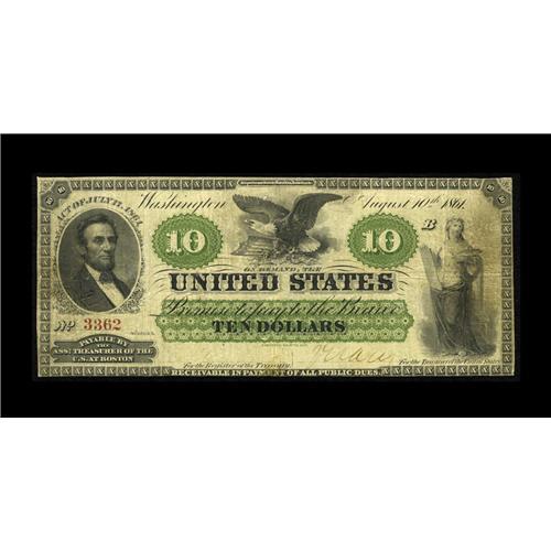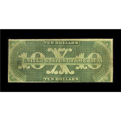 <B>Fr. 8 $10 1861 Demand Note Fine.</B></I> We originally sold this note in September 1996 and it still remains the lowest serial number for this Friedberg number. The margins are quite close, glancing the design in just a few places, but the note is otherwise flawless for the grade with no faults or repairs.<BR><I>From The Bill and Kathy Stella Currency Collection</B></I><BR><BR><b>Shipping:</b> Coin/Currency (<a target="_blank" href="http://www.heritageauctions.com/common/shipping.php">view shipping information</a>)