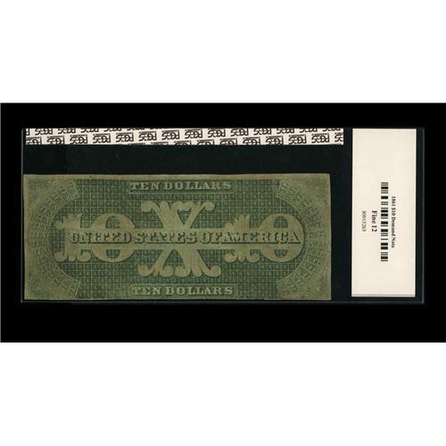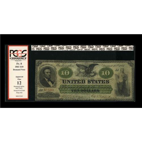 <B>Fr. 8 $10 1861 Demand Note PCGS Apparent Fine 12.</B></I> The PCGS red-holder comment is, "repaired splits and tears." The note is very well signed, with decent color, and the splits and tears are rather well closed and not particularly apparent. Ten Dollar Demand Notes are, in our opinion, quite underrated.