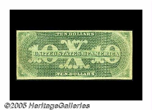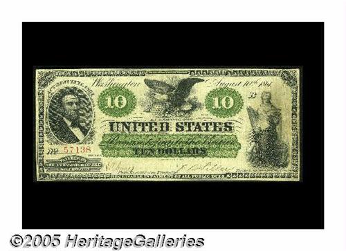 <B>Fr. 8 $10 1861 Demand Note Very Fine.</B></I> A really nice $10 Demand Note that has obviously circulated, but has remained totally free of problems. The pen signatures are strong and all the colors, both face and back, are as bright as the day the note was printed. It is also unusually, nicely margined for a Demand Note, with the margins clear of the frame line at all points. Although prices have increased recently this type has historically been and continues to be the most undervalued area of Federal currency in this cataloger's opinion. We sold this note twice before - most recently five years ago when it realized $9,625.