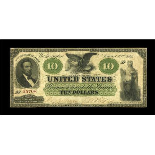 <B>Fr. 8 $10 1861 Demand Note Very Good.</B></I> Previously sold in our FUN 2006 auction where it was cataloged, "There are a few tiny pinholes and the margins are close, but this well-circulated Ten Dollar Demand Note exhibits no other defects. The hand signatures remain strong and the note has kept the majority of its color and clarity on both sides."<BR><BR><b>Shipping:</b> Coins & Currency (<a target="_blank" href="http://www.heritageauctions.com/common/shipping.php">view shipping information</a>)