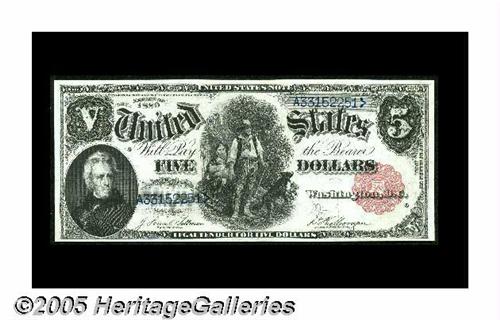 <B>Fr. 80 $5 1880 Legal Tender Gem New.</B></I> Great centering and excellent print quality dominate this gorgeous Woodchopper.