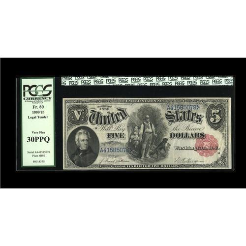 <B>Fr. 80 $5 1880 Legal Tender PCGS Very Fine 30PPQ.</B></I> Plenty of serial number to seal contrast on this well centered Woodchopper.