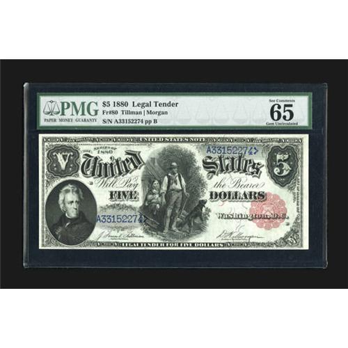 <B>Fr. 80 $5 1880 Legal Tender PMG Gem Uncirculated 65 EPQ.</B></I> Boldly printed and displaying cavernous embossing, a simply lovely example.<BR><BR><b>Shipping:</b> Coins & Currency (<a target="_blank" href="http://www.heritageauctions.com/common/shipping.php">view shipping information</a>)