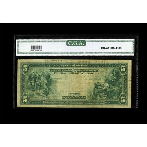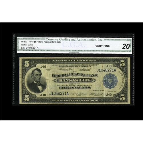 <B>Fr. 803 $5 1918 Federal Reserve Bank Note CGA Very Fine 20.</B></I> While not as scarce as the 801 and 802, only about fifty recorded examples of this Friedberg number are known. Only one example was uncirculated, the Amon Carter example. This piece remains whole and is problem free save for some patterned toning on back.
