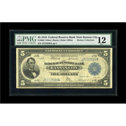 <B>Fr. 804 $5 1918 Federal Reserve Bank Note PMG Fine 12.</B></I> Save for a couple pinholes this note is solid, both the paper and print quality.<BR><I>Ex: Rickey Collection</B></I>