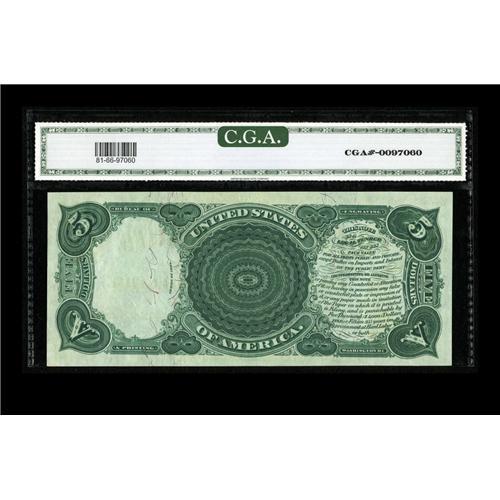 <B>Fr. 81 $5 1880 Legal Tender Courtesy Autograph CGA Gem Uncirculated 66.</B></I> An absolutely lovely 1880 Pioneer Five, with easily seen deep, original embossing as well as broad margins and perfect colors. Fr. 81 is a considerably scarcer note, with only about 75 examples known, as compared to over 200 for its type-mate Fr. 80. This note has the distinction of being autographed by former Treasurer of the United States D.N. Morgan.