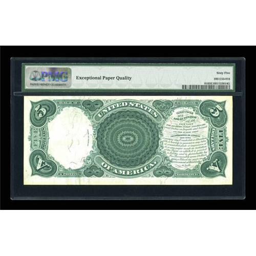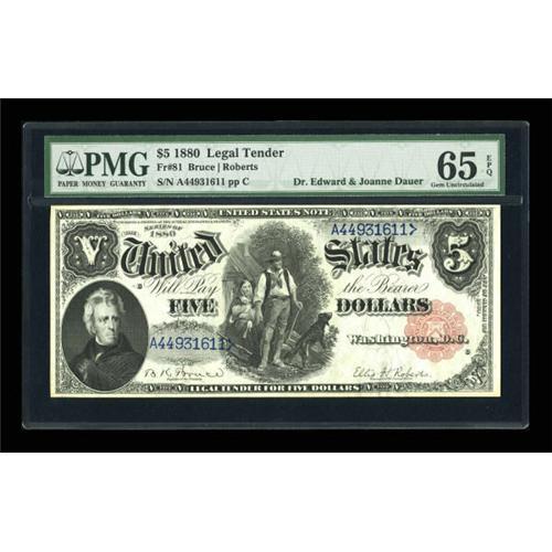 <B>Fr. 81 $5 1880 Legal Tender PMG Gem Uncirculated 65 EPQ.</B></I> About 90 examples exist of this number, and not very many of them could be nicer than this piece. It is well margined with good eye appeal and decent back centering. PMG has granted this note its "Exceptional Paper Quality" comment. This type is illustrated on page 81 of the Dauers' book, but this is not the note used for that illustration. Andrew Jackson, our seventh president, served two terms between the years 1829 and 1837. According to the Dauers' book, "Born in a backwoods settlement in the Carolinas in 1767, Jackson was self educated. He was elected president by popular vote with more votes than any of his predecessors." <BR><I>From The Dr. Edward & Joanne Dauer Collection</B></I><BR><BR><b>Shipping:</b> Coins & Currency (<a target="_blank" href="http://www.heritageauctions.com/common/shipping.php">view shipping information</a>)