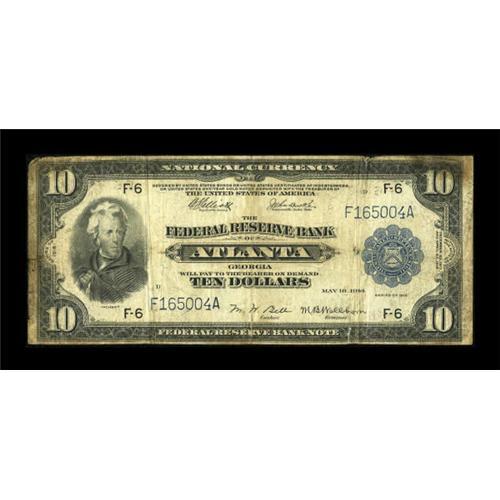 <B>Fr. 812 $10 1918 Federal Reserve Bank Note Very Good.</B></I> Well worn with some staining at the edges. This Atlanta District FRBN Ten is quite a scarce note with only thirty examples known. <BR><BR><b>Shipping:</b> Coins & Currency (<a target="_blank" href="http://www.heritageauctions.com/common/shipping.php">view shipping information</a>)