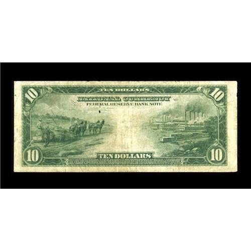 <B>Fr. 813 $10 1915 Federal Reserve Bank Note Fine.</B></I> This is a scarce type that was only issued by half of the Federal Reserve Banks. This is an ideal note that is free of tears or pinholes for the type collector.<BR><I>From The Bill and Kathy Stella Currency Collection</B></I><BR><BR><b>Shipping:</b> Coin/Currency (<a target="_blank" href="http://www.heritageauctions.com/common/shipping.php">view shipping information</a>)