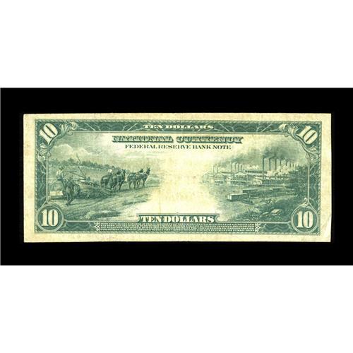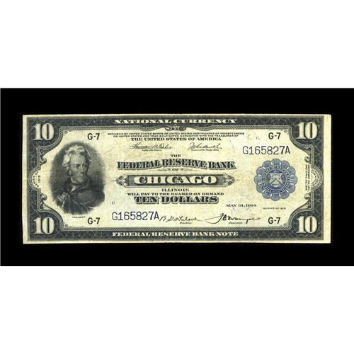 <B>Fr. 814 $10 1918 Federal Reserve Bank Note Fine.</B></I> A little flatness is noted on this scarcer, colorful Chicago Sawbuck.<BR><I>From The Bill and Kathy Stella Currency Collection</B></I><BR><BR><b>Shipping:</b> Coin/Currency (<a target="_blank" href="http://www.heritageauctions.com/common/shipping.php">view shipping information</a>)