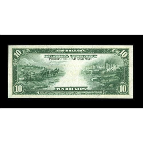 <B>Fr. 817 $10 1915 Federal Reserve Bank Note Gem New.</B></I> Natural paper ripple and embossing adorn this $10 that is newly discovered but falls nicely within a CU run of notes in the census.<BR><I>From The Plymouth Rock Collection</B></I>