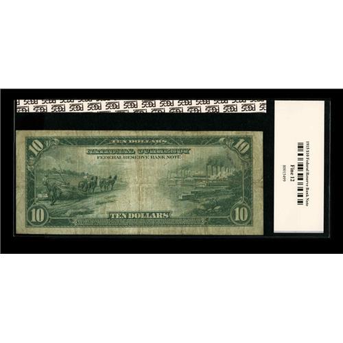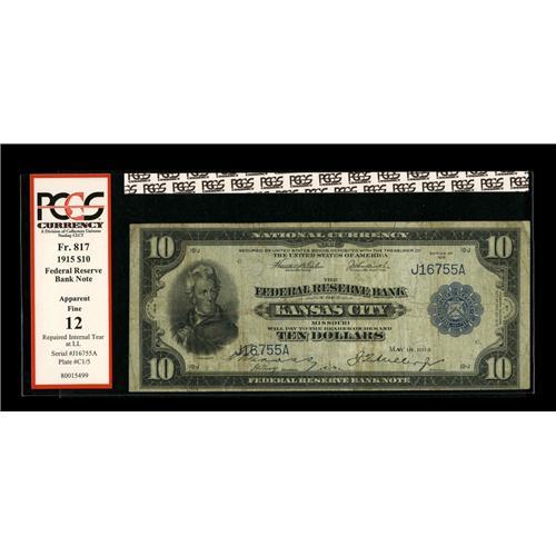 <B>Fr. 817 $10 1915 Federal Reserve Bank Note PCGS Apparent Fine 12.</B></I> This Kansas City sawbuck is intact and colorful, but was gigged for an internal tear at lower left.