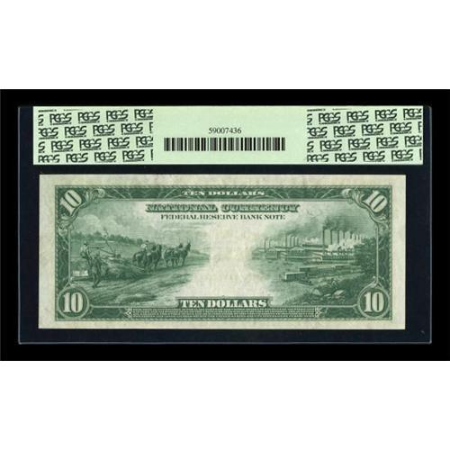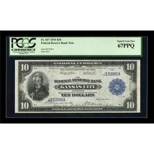 <B>Fr. 817 $10 1915 Federal Reserve Bank Note PCGS Superb Gem New 67PPQ.</B></I> PCGS has graded only this note and one other at this 67 level. This Kansas City District has supplied most of the high-end Ten Dollar Federal Reserve Bank Notes that are in the hands of today's collectors, and this one is as high-end as they get. Simply not enough can be said about this gorgeous note, which on top of all its obvious qualities, has also gotten the important Premium Paper Quality designation.<BR><BR><b>Shipping:</b> Coins & Currency (<a target="_blank" href="http://www.heritageauctions.com/common/shipping.php">view shipping information</a>)