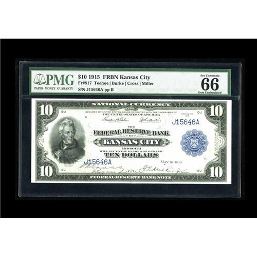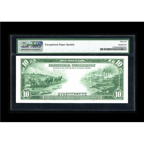 <B>Fr. 817 $10 1915 Federal Reserve Bank Note PMG Gem Uncirculated 66 EPQ.</B></I> We first sold this note in May of 1999 for $3,520. Now certified by PMG and displaying well balanced margins all around, as well as exceptionally vibrant color, we expect that it will do considerably better tonight, likely selling for...<BR><BR><b>Shipping:</b> Coin/Currency (<a target="_blank" href="http://www.heritageauctions.com/common/shipping.php">view shipping information</a>)