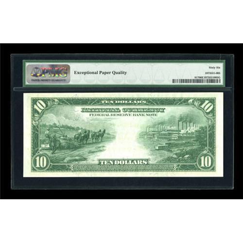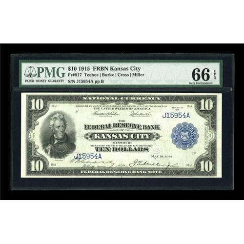 <B>Fr. 817 $10 1915 Federal Reserve Bank Note PMG Gem Uncirculated 66 EPQ.</B></I> Most of the nice 817's come from this same serial-number run, but very few are as nice as this piece, which has wonderful paper surfaces, perfect color and broad, even margins. PMG has graded 20 examples of this Friedberg number, but none grades higher than this beautiful 66. The note has also earned PMG's all-important "Exceptional Paper Quality," award. If you are looking for a lovely Ten Dollar FRBN to fill out a type set, you need look no further.<BR><BR><b>Shipping:</b> Coins & Currency (<a target="_blank" href="http://www.heritageauctions.com/common/shipping.php">view shipping information</a>)